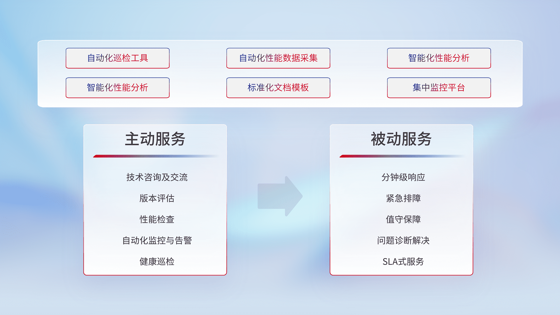 智能化工具和标准化文档,,,保障服务质量,,,提供主动服务(包含技术咨询、、、版本评估、、性能检查、、自动化监控与告警、、健康巡检)和被动服务包含(分钟级响应、、紧急排障、、值守保障、、、、问题诊断解决、、SLA服务)。。。
